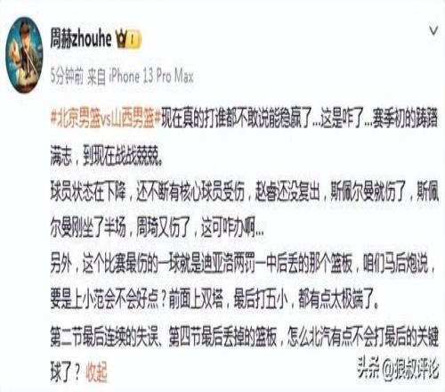 翟晓川末节已经拼老命拿了13分5篮板2盖帽,但北京攻防缺口太多了,被去年季后赛遭到自己横扫的山西完成复仇。