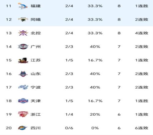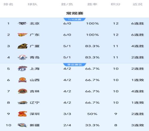 CBA六轮排名!京粤占前2,辽宁下滑第7,吉林青岛黑马,鲁浙倒数