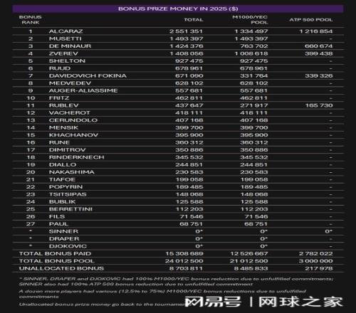 ATP针对大师赛和500赛事稳定参赛所设立的奖金,金额已可与大满贯奖金相媲美。目前的奖金榜显示,阿尔卡拉斯达到了一个里程碑式的数字,然而由于违反ATP相关政策,他在历史赛季收入上仍排在德约科维奇之后。