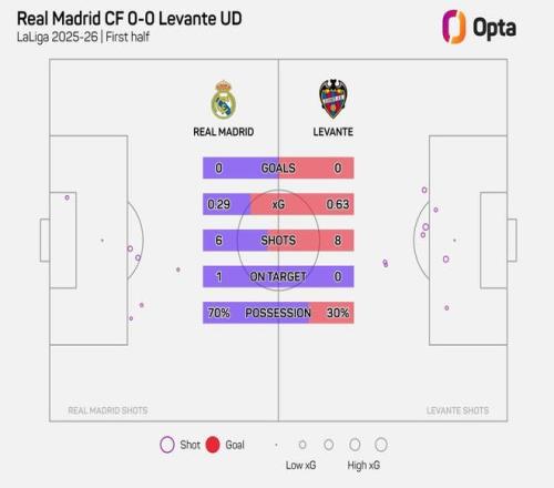 本场比赛上半时皇马的表现很难用出色来形容,前45分钟他们只尝试了6次射门,1次射正,相较而言莱万特上半时的射门次数达到了8次。