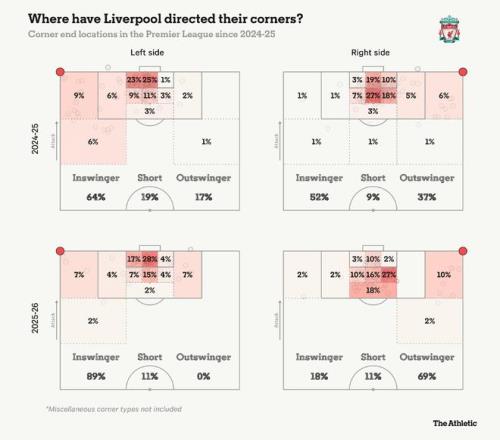 由于罗伯逊无法稳定出场,利物浦的角球也变得难以预测,上赛季,左脚球员的传中或许会更加多样化,但现在对手可以确信,利物浦的角球总是从左侧角球区内旋,从右侧角球区外旋。在定位球专家教练辈出的时代,缺乏出其不意只会让对手更加得势。