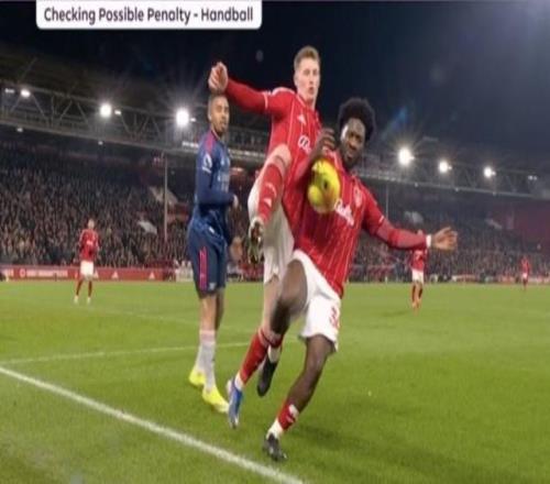 阿森纳0比0诺丁汉森林,阿尔特塔对本队被漏判点球意难平。比赛尾声,森林后卫艾纳在底线疑似用手捞球(图③),经VAR复核后未判点球。英超裁判公司解释称,“球先碰到艾纳的肩膀,而且他的手臂也处于自然位置。”阿尔特塔赛后抗议:“这个解释不对。那是一个明显的点球。对,球是先击中他的肩膀,然后他用手把球捞住了,意图非常明显。否则我就不会在这里说了。”森林主帅戴奇直斥塔哥的点球申诉“荒谬”,并表示如果这要是判罚点球,那足球比赛就干脆别踢了。