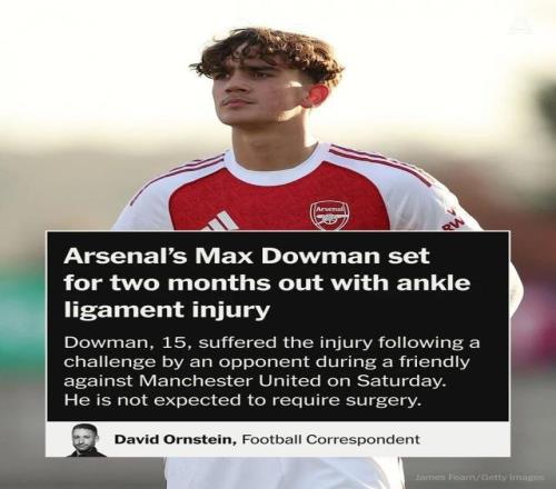 本赛季,15岁的青训天才道曼升入阿森纳一线队,在英超和欧冠中大放异彩,成为欧冠历史上最年轻的出场球员。本赛季至今,道曼共代表阿森纳一线队出战5次,其中1次首发,斩获1次助攻。然而,上周末代表阿森纳U21出战对阵曼联的友谊赛时,道曼遭遇一次恶劣犯规,预计将休战约两个月,这对主帅阿尔特塔无疑是个打击。