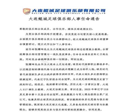 大连鲲城上个赛季作为升班马,最终排名第8,中甲球队想要冲超其实并不难,选好三名外援,按照发工资,成绩不会差。这是张耀坤首次担任职业联赛主教练,接手鲲城若能和大奎联手冲超,将会成为一段佳话。张耀坤退役之后,大部分时间都在青训领域深耕,此次走向职业联赛并且担任总经理,说明了球队对他的信任和鲲城换个活法的决心。