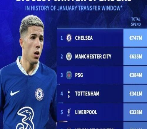 冬窗开启已经有一段时间了,德转也统计了历史冬窗各个俱乐部的累计支出,切尔西以7.47亿欧元支出排名榜首,前十名...